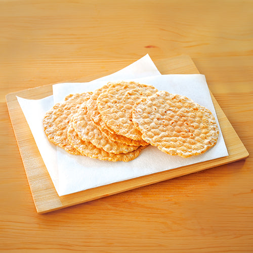新鮮なアカシャ海老を参宮あわびの煮汁で味を調え、馬鈴薯澱粉を加えて一枚一枚を丹念に真心込めて焼き上げました。