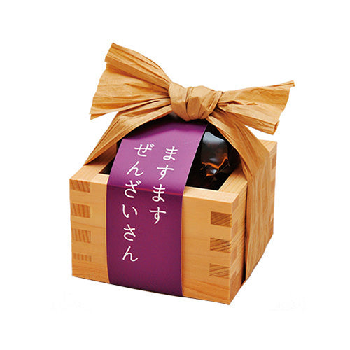 皆さまの「より一層」のご多幸やご商売の繁盛を願い、特製の木枡(ます)に入れて「ますます」と命名し、各種お祝いごとにご利用いただけるよう調製いたしました。