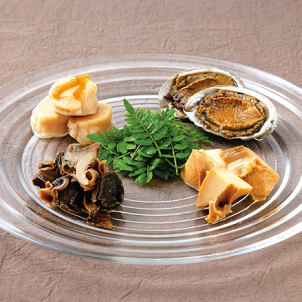- 参宮あわび脹煮1個(70g)、参宮あわび姿脹煮1個(殻、肝付)、ほたて貝柱脹煮1袋(80g)、一口あわび姿脹煮1袋(4個・だし170g)、つぼやき1袋(80g)