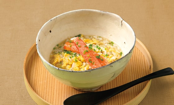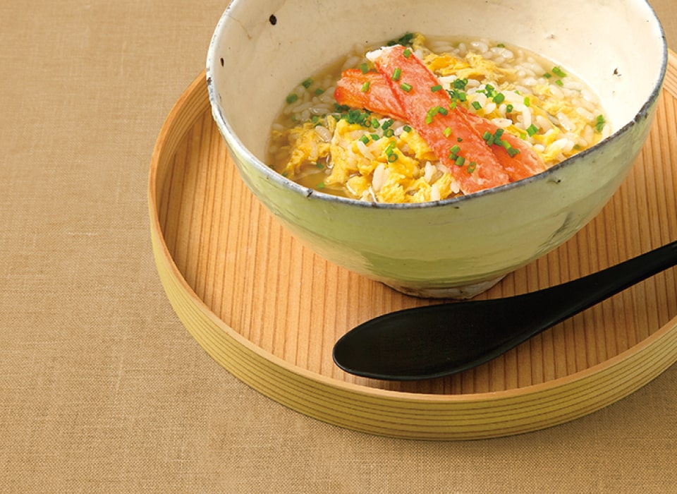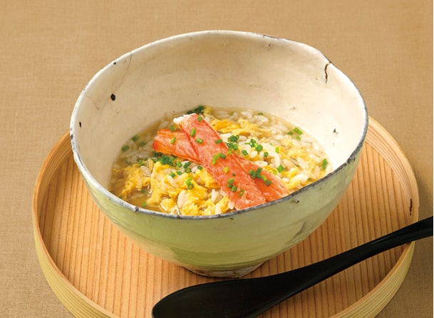 本品を火にかけ、ごはんを入れてとき卵を散らせば、美しい蟹の身入りの濃厚な蟹雑炊が出来上がります。